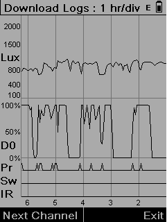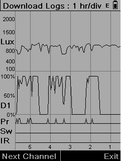 Activity on each channel is reported. In the case of a Master Dimming Sensor, this would comprise 3 channels: QuickLink connection channel, Dimming channel and Switching channel. Activity includes presence, switch input, infrared input and lux level. Each channel is shown on a separate screen: